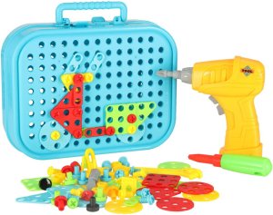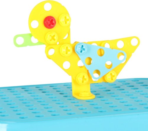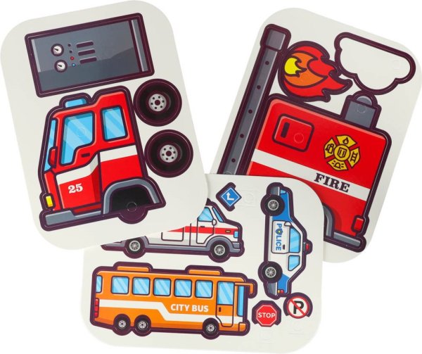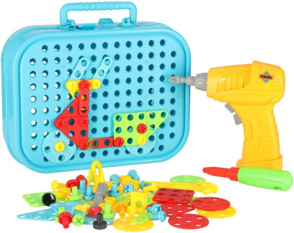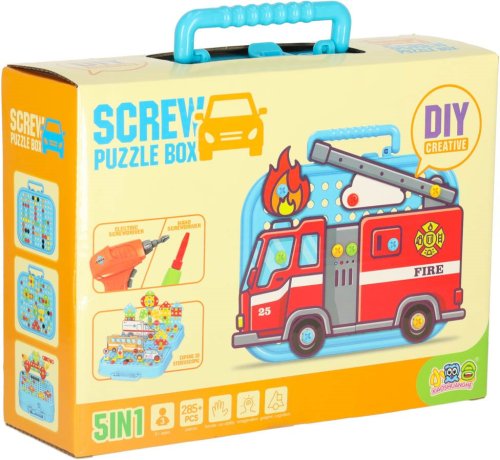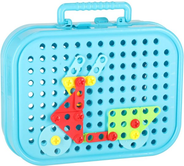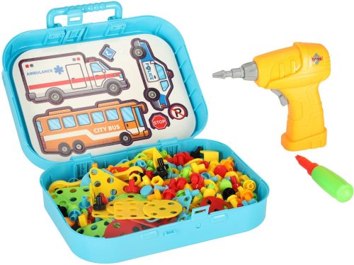 Procvičování manuální zručnosti a jemné motoriky, kreativity a poznávání tvarů, praktický plastový kufřík sloužící jako kreativní "plátno" a úložný prostor, barevné bloky a šrouby se vkládají pomocí šroubováku nebo bateriové vrtačky do otvorů v kufříku, kartonové figurky s dopravní tematikou umožňují vytvářet 3D díla.