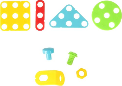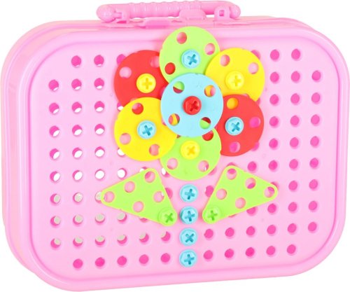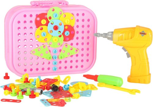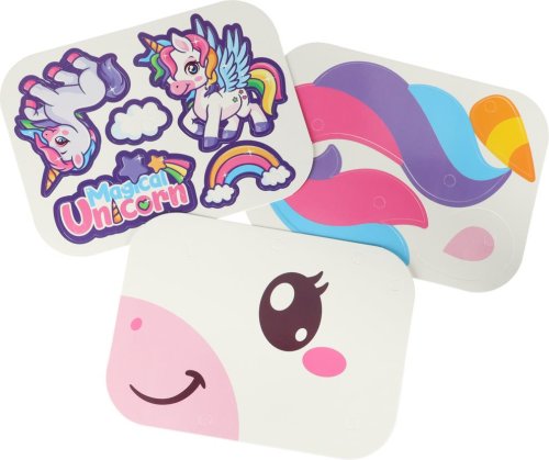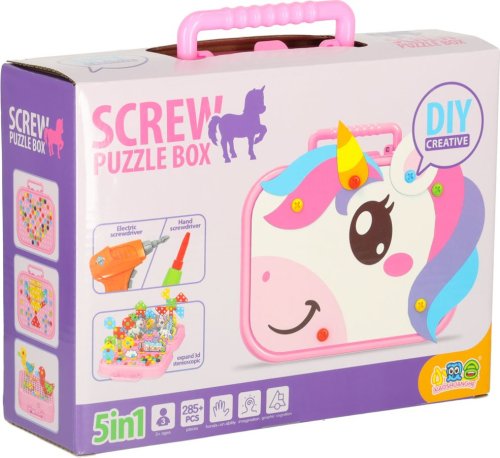 Procvičování manuální zručnosti a jemné motoriky, kreativity a poznávání tvarů, praktický plastový kufřík sloužící jako kreativní "plátno" a úložný prostor, barevné bloky a šrouby se vkládají pomocí šroubováku nebo bateriové vrtačky do otvorů v kufříku, kartonové figurky s tematikou jednorožců umožňují vytvářet 3D díla.