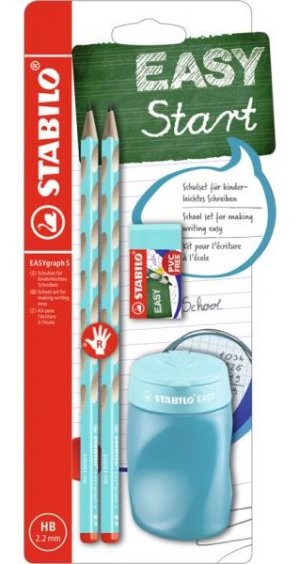 Školní set určený pro praváky. Balení obsahuje: 2x tužka, 1x ořezávátko a 1x pryž