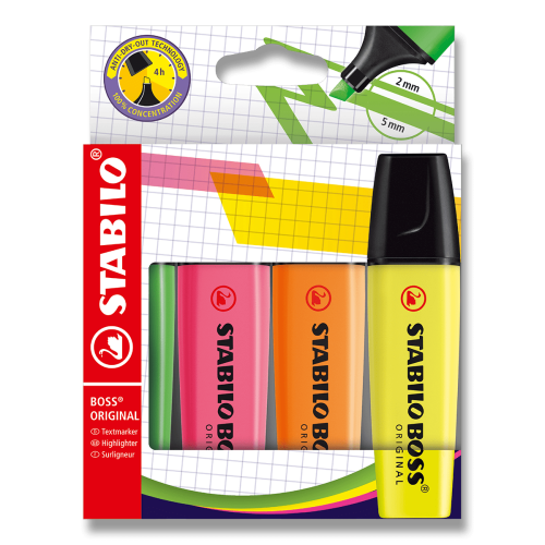 Zvýrazňovače s klínovým hrotem, šíře stopy 2-5 mm s reflexním inkoustem pro univerzální použití na všech druzích papíru. Vydrží až 4 hodiny bez víčka.