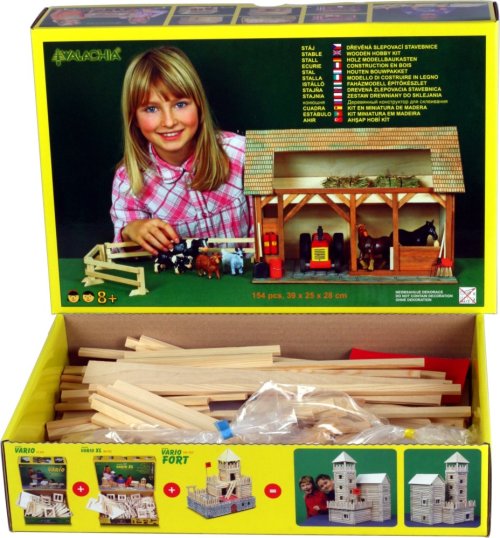 Dřevěná slepovací stavebnice Walachia - Stáj. Slepovací stavebnice Walachia jsou dřevěné modely domečků a staveb z Valašského kraje v měřítku 1:32. Základem jsou dřevěné hranolky 9x9 mm a k tomu jsou v sadě vždy všechny papírové doplňky - okna, dveře, střešní části atd. Pro lepení se používá lepidlo Herkules, není však součástí stavebnice. Přiložený je montážní návod a malé kapitoly z historie lidové architektury. Rozměry: 39 x 25 x 28 cm. Počet dílů stavebnice: 154