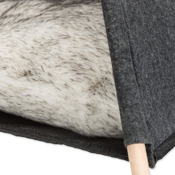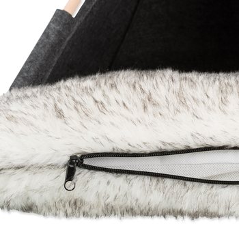 Jeskyně je vybavena oboustranným polštářkem, což přináší možnost variabilního využití. Na jedné straně je polštářek pokryt potahem z plyšové látky s dlouhým vlasem, vyrobeným z polyesteru. Tento materiál je zvolen z důvodu jeho extrémní měkkosti a schopnosti poskytnout teplý a příjemný pocit, což je ideální pro chladnější dny. Na druhé straně polštáře nalezneme tkanou látku, která je vyplněna polyesterovým flísem.