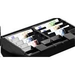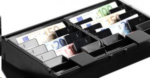 Kombinace přihrádek na hotovost: 8 na bankovky a 8 na mince plus externí přihrádka na kupóny / šeky