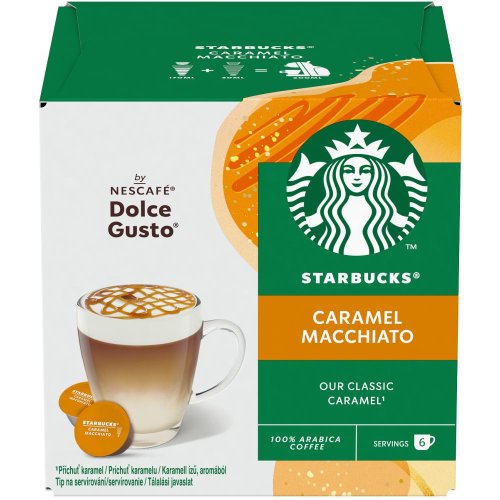 Intenzita 3 Objevte ikonické a krémové Starbucks Caramel Macchiato Dopřejte si lahodnou smetanovou směs s mlékem a karamelovou příchutí, inspirovanou Starbucks Caramel Macchiato, které jste si oblíbili Užijte si Starbucks v pohodlí svého domova Vytvořené speciálně pro kávovary Nescafe Dolce Gusto