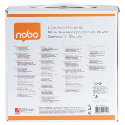 Obsahuje: 4 popisovače na skleněné tabule, stěrku na skleněné tabule, čisticí pěnu Nobo, čisticí hadřík z mikrovláken Nobo a 4 extra silné magnety na magnetické tabule