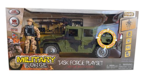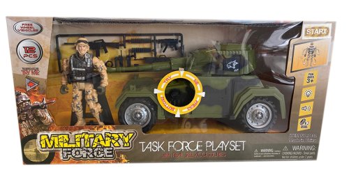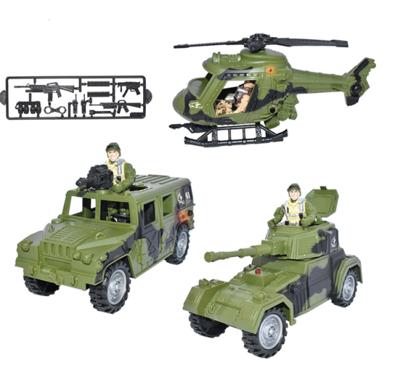 Vojenská sada se světelnými a zvukovými efekty. Obsahuje vojenské vozidlo nebo helikoptéru, postavičku vojáka a další příslušenství.