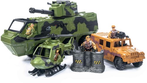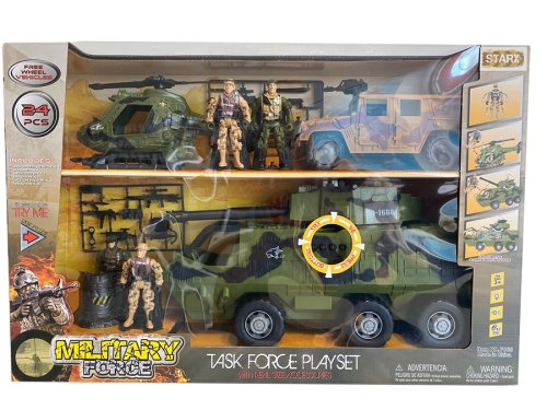 Velká sada vojenských vozidel se zvukovými a světelnými efekty. Sada obsahuje obrněný transporter, helikopteru, jeep, vojáčky a salší příslušenství.