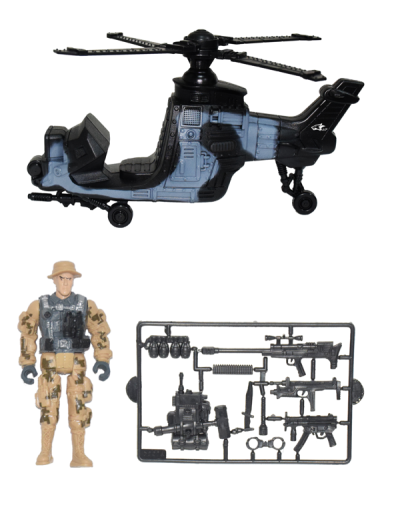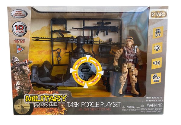 Vojenská sada se světelnými a zvukovými efekty. Obsahuje vojenské vozidlo, postavičku vojáka a další příslušenství.