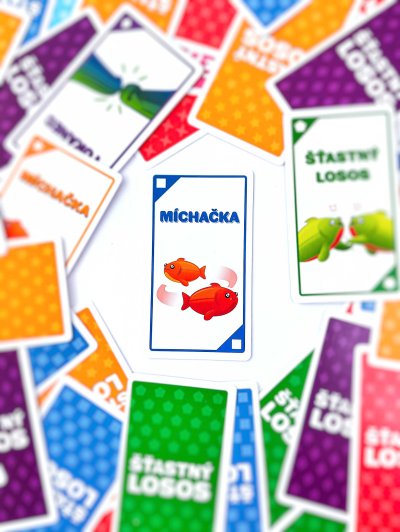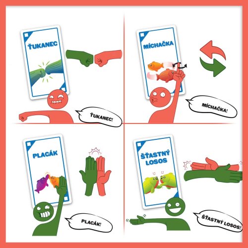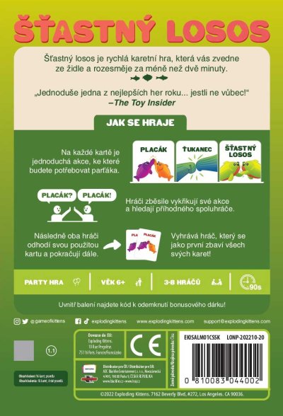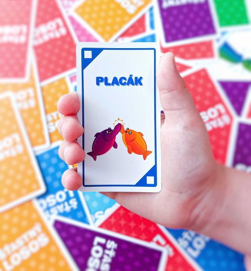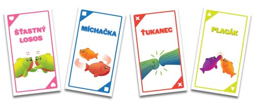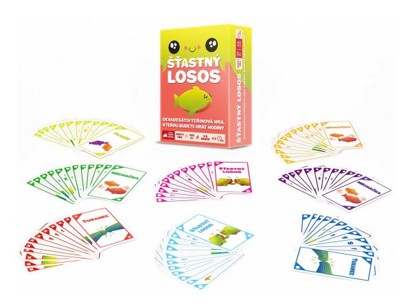 Šťastný losos je rychlá, pohybová a HLASITÁ hra, která vás rozesměje za méně než dvě minuty. Takže vykliďte prostor, zbavte se židlí a pokud vám srdeční tep vyskočí na 120 úderů za minutu, nejspíš to děláte dobře.Jak na hru? Na každé kartě je jednoduchá akce, ke které budete potřebovat parťáka. Hráči zběsile vykřikují své akce a hledají příhodného spoluhráče. Jakmile ho najdou, vykonají společnou akci, odhodí použitou kartu a pokračují dál. Vyhrává hráč, který se jako první zbaví všech svých karet!Pokud z nějakých, jistě dobrých, důvodů potřebujete být při hraní potichu, vyzkoušejte tichou variantu hry, která se skvěle hodí do přecpaných barů, knihoven a jiných míst, ze kterých byli naši testeři vykopnuti.Obsah balení:96 karetčeská pravidla