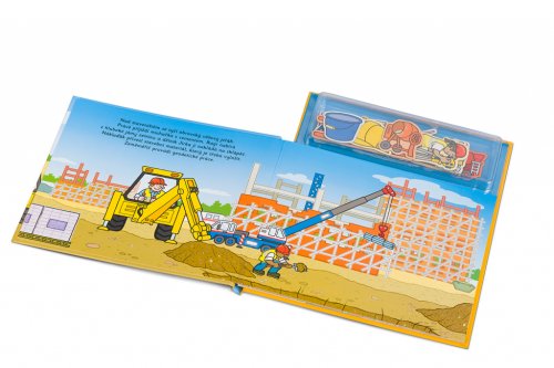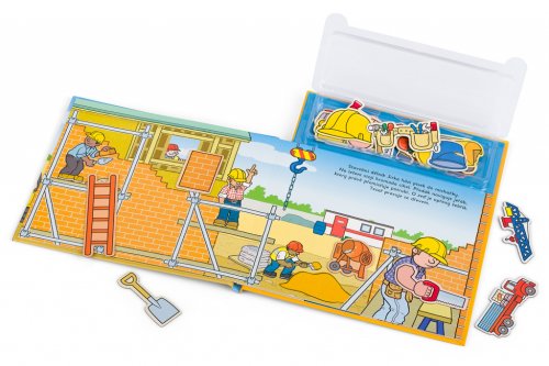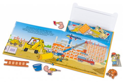 Na staveništi je pořád rušno – co se tam asi bude dít dnes? Jeřáb, míchačka, sklápěč, nejrůznější nářadí, ale třeba taky ochranná helma – to všechno je na stavbě potřeba. A těch dělníků a řemeslníků různých profesí! Na každé stránce téhle knížky objeví děti kratičký příběh, který mohou spoluvytvářet pomocí magnetek. A až si do sytosti vyhrají, mohou všechny magnetky zase pěkně uklidit zpátky do úložného boxu, kde budou připraveny na další skvělou zábavu.