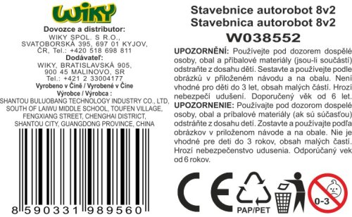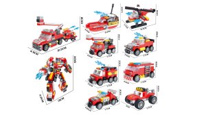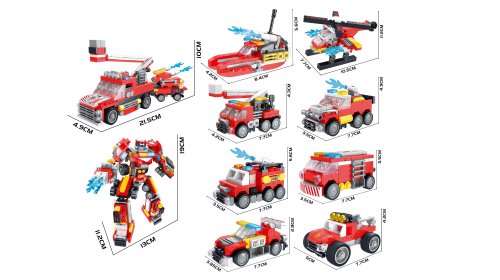 Stavebnice autorobot. Rozměry robota 11,2x13x19 cm, hasičského auta 21,5x4,9x10 cm. 731 dílků. Možno sestavit jednoho robota a 9 aut.