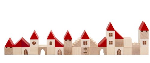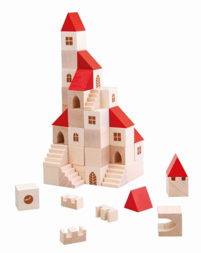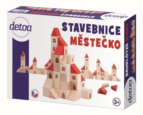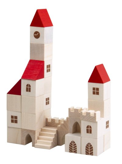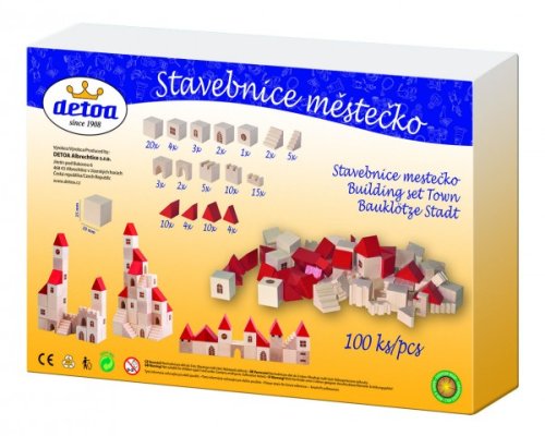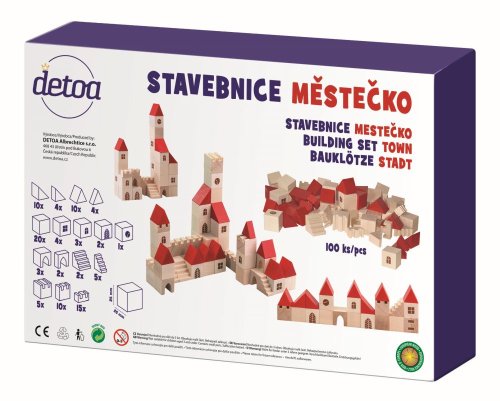 Stavebnice obsahuje 96 dřevěných dílků s potiskem v různých tvarech a velikostech. Základní velikost krychle je 25 mm.