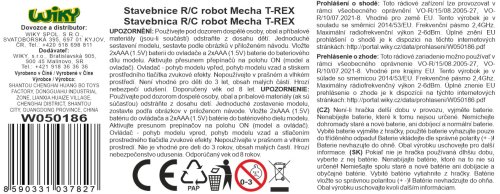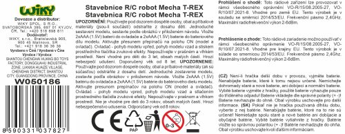 Stavebnice RC dino robot Mecha T-REX. Rozměry složeného robota 21,6x7,3x11,7 cm. Frekvence 2,4 GHz. Vydává zvukové efekty. Ovládání - levé tlačítko - pohyb dopředu, pravé tlačítko - pohyb dozadu, prostřední tlačítko - zvukové efekty. Schéma na sestavení na obalu. Pohyblivý ocas a hlava. Sada obsahuje 41 dílů. Robot - 2xAAA baterie, nejsou součástí. Ovladač - 2xAAA baterie, nejsou součástí.