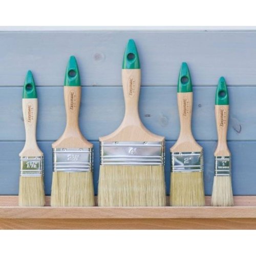 Profesionální ploché štětce mají lakovanou rukojeť z bukového dřeva a zelený otvorem pro zavěšení.