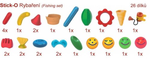 Nová magnetická stavebnice pro nejmenší! Tematická sada obsahující 26 dílků zaměřených na tvoření a chytání vodních zvířátek (rybky a jiná roztomilá vodní havěť). Při hraní se můžete inspirovat obrázky z přiložené brožurky nebo popustit uzdu fantazii a vrhnout se do lovení vlastních mořských potvůrek. Balení obsahuje i malý rybářský prut (tyčka + kladka s magnetem). Dílky oplývají sytými barvami a hlavní důraz je kladen na jejich bezpečnost. Stavebnice je použitelná prakticky bez věkového omezení a díky překvapivé variabilitě si s ní často rádi hrají i starší sourozenci a rodiče. Dílky z této sady lze libovolně kombinovat se všemi ostatními Stick-O stavebnicemi. Vhodné pro děti od 18 měsíců.