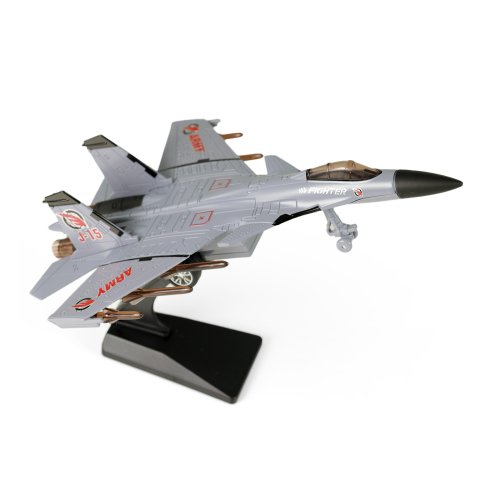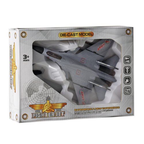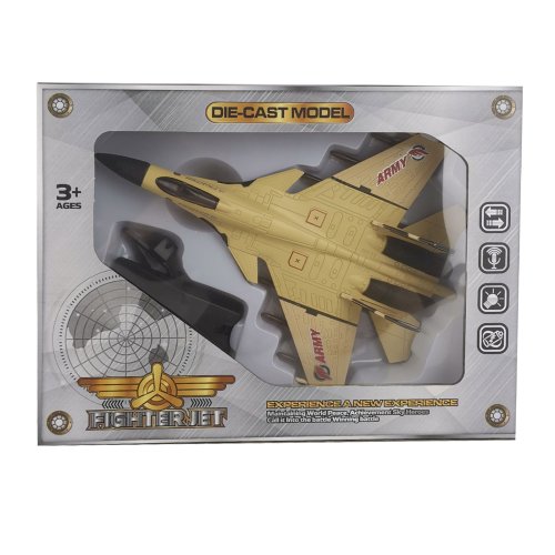 Vojenská stíhačka v hnědé barvě se zvukem a světlem. Vydává různé zvuky, bliká a svítí. Skvělé nejen pro všechny milovníky letadel. Jezdí na zpětný setrvačník. Velikost 23 cm. Letadlo vyžaduje použití 3 ks baterií typu AG13, které jsou součástí výrobku.