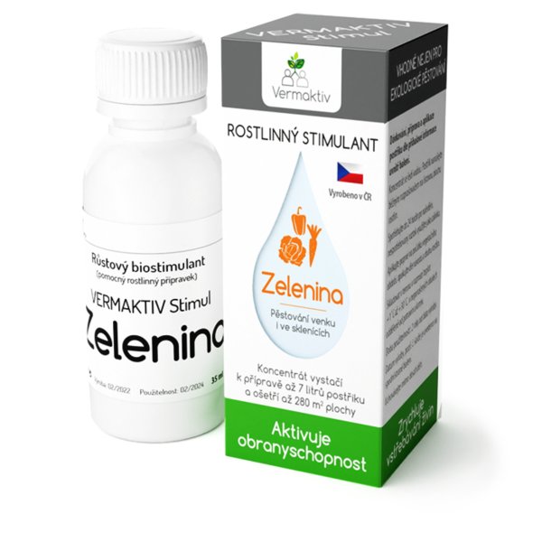 Růstový stimulant Vermaktiv Stimul Zelenina o objemu 35 ml je vhodný pro všechny druhy zeleniny – plodová (rajčata, papriky, okurky, dýně, melouny), listová (chřest, hlávkový salát, špenát, čekanka listová, mangold, rukola), kořenová (brambory, dýně, mrkev, křen, řepa, tuřín, ředkvička), hlízová (celer, fenykl, yams), košťálová (artyčoky, zelí, Pak Choi, kapusta, kedlubna, květák, brokolice, romanesco), cibulová (cibule, česnek, pórek, pažitka) i lusková zelenina (hrách, cizrna, fazole, čočka, sója).