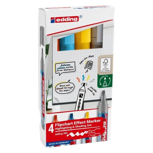 Stínovací popisovač edding 385 je především určený pro stínování či zvýraznění nápadů a témat při prezentacích - zlepšuje viditelnost důležitých faktů a závěrů. Inkoust byl speciálně vyvinut pro flipchartový papír a pro prezentační karty, je však vhodný i pro nejrůznější kreativní činnosti na papíru vyšší gramáže. Inkoust na vodní bázi nabízí intenzivní barvy. Flexibilní hrot umožní stínování a akcentování textu, grafů či náčrtků. Cap-off inkoust nevyschne i několik dnů, pokud je popisovač ponechán bez víčka. Napsaná stopa rychle zasychá a nepropíjí se. Popisovač je znovu naplnitelný, prodloužením jeho životnosti pomůžete snížit množství komunálního odpadu. Tělo popisovače je vyrobeno z 55 % z recyklovaného plastu. Klip na víčku brání skutálení popisovače. Flexibilní kaligrafický hrot. Šíře stopy: 1-5 mm. Sada obsahuje 4 výrazné barvy: žlutou, oranžovou, tyrkysovou a stříbrošedou. Vyrobeno v Německu.