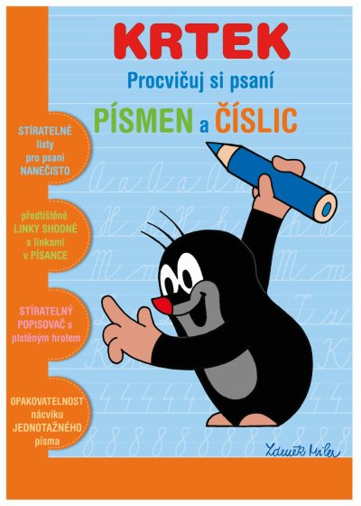 12 stran včetně obálky , součástí výrobku stíratelný popisovač modré či černé barvy , lesklý povrch zaručuje opakovatelnost , sešit slouží k opakovanému nácviku písmen a číslic , vše vloženo v transparentním sáčku