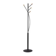 Moderní volně stojící ocelový věšák Černý matný povrch a kulaté dřevěné hroty v bukovém provedení 4 kovové háčky s hroty o průměru 3,3 cm ve dřevě, pevně nalepené Hodí se i do malých prostor Stabilní …