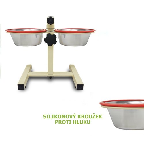 Výškově nastavitelný stojánek v bílé barvě se dvěma nerezovými lavorky usnadní přístup k potravě.