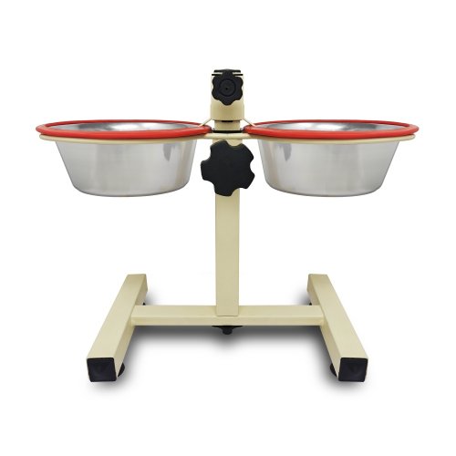 Výškově nastavitelný stojánek v bílé barvě se dvěma nerezovými lavorky usnadní přístup k potravě. Nastavení výšky lze přizpůsobit dle potřeb.