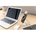 Stojánek lze kompletně složit, snadno se tak vejde do brašny nebo do batohu. Vložený telefon ve stojánku pohodlně nastavíte do správného úhlu. Pro naprosté bezpečí vašeho mobilního telefonu je horní část stojánku pokrytá jemným silikonem, který zabrání poškrábání i nechtěnému sklouznutí. V zadní části stojánku najdete otvor pro protáhnutí nabíjecího kabelu.