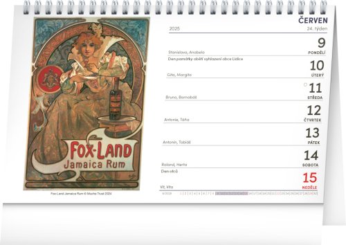 Průřez tvorbou Alfonse Muchy zobrazený na 53 reprodukcích secesního malíře a designéra, který se proslavil tvorbou plakátů pro divadelní představení. Týdenní stolní kalendář s českými jmény obsahuje také svátky, památné dny, fáze měsíce a přehled na celý rok 2025 a 2026.
