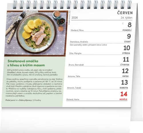V kalendáři najdete 53 pečlivě vybraných receptů z tradiční české kuchyně. Týdenní kalendárium s prostorem pro poznámky obsahuje také svátky, památné dny, měsíční fáze a přehled na celý rok.