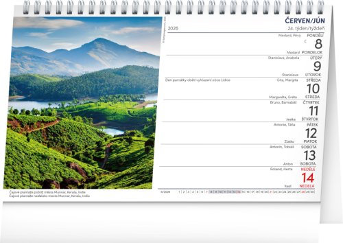 S každou další fotografií se přesunete do nádherné krajiny v různých částech světa. V kalendáři na vás čeká 53 úchvatných záběrů krajiny z celého světa, dále česko-slovenské kalendárium, svátky a památné dny, měsíční fáze a seznam českých a slovenských jmen.