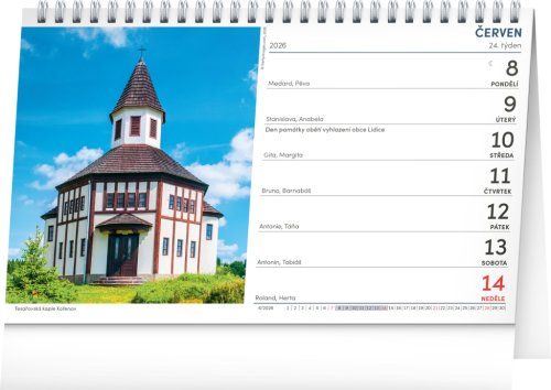 Hory i doliny z celé České republiky v třiapadesáti obrazech. Stolní kalendář s českým kalendáriem obsahuje svátky a památné dny, měsíční fáze a přehled na celý rok.