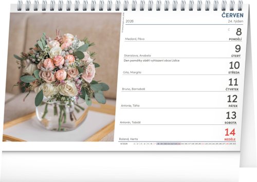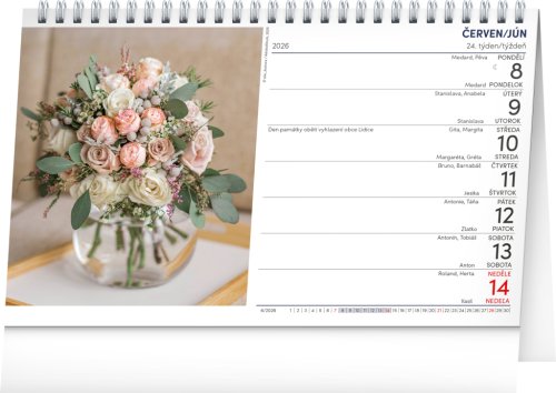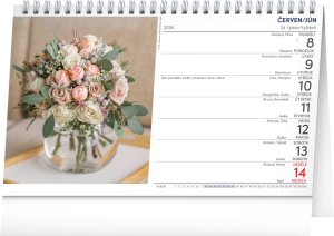 Okrasné květiny a květinová aranžmá na stránkách stolního kalendáře, který se vejde opravdu všude. V česko-slovenském kalendáři je rovnocenně zahrnuta čeština a slovenština, česká a slovenská jména, svátky, památné dny i měsíční fáze. V každém dni je prostor pro poznámky.