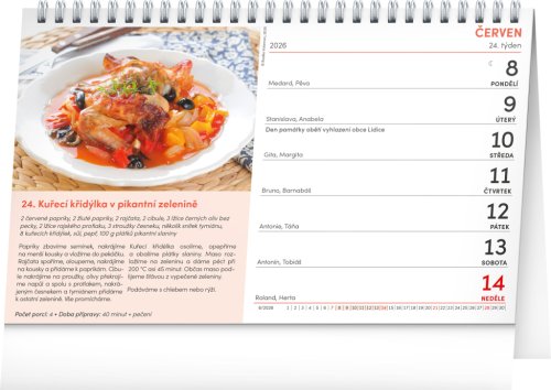 53 receptů na světoznámá jídla ze středomořské kuchyně. Zkuste si připravit každý týden jiný pokrm z této nabídky! Týdenní kalendárium s prostorem pro poznámky obsahuje také svátky, památné dny, měsíční fáze a přehled na celý rok 2026 a 2027.