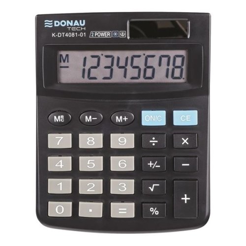 Stolní kalkulačka Nakloněný display 8-místný displej Funkce: odmocnina, procenta Funkce automatického vypnutí Barva: černá Materiál: plast včetně tlačítek Rozměry: 134 x 104 x 17 mm Ideální do kanceláře …