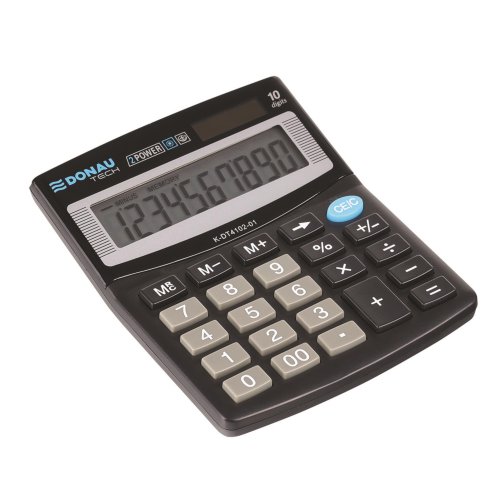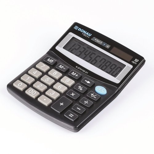 Stolní kalkulačka Nakloněný display 10-místný displej Funkce: procenta Funkce automatického vypnutí Barva: černá Materiál: plast včetně tlačítek Rozměry: 125 x 100 x 27 mm Ideální do kanceláře na váš …