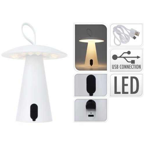 Plastová stolní lampa. Dobíjecí. USB kabel délky 1m v balení.Rozměr 15 x 17 cm16 Led žárovek3 režimy ztmíváníBarva: bílá