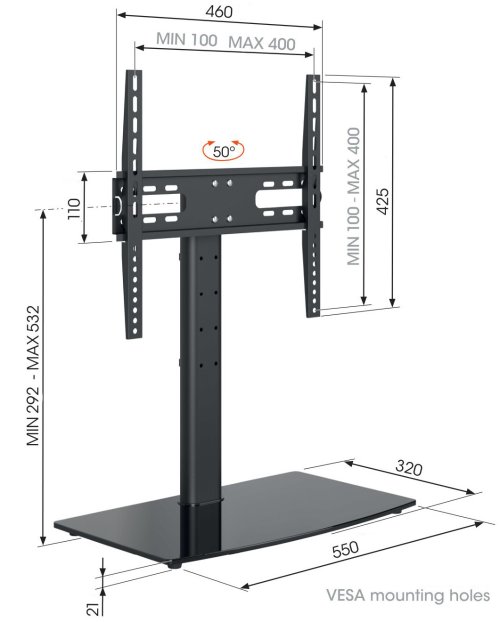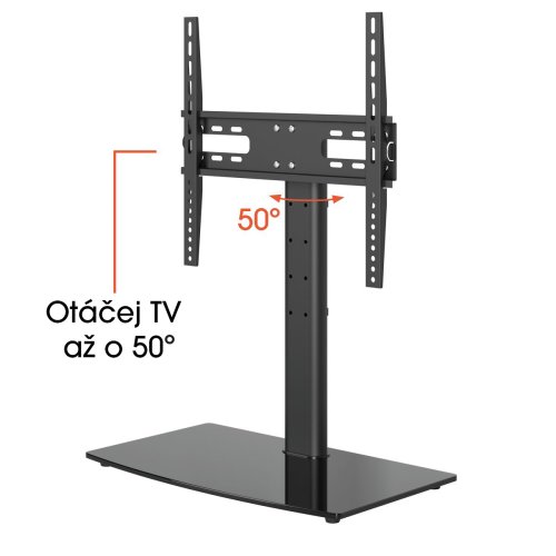 Díky základové desce o rozměrech 55 x 32 cm nepotřebujete tak širokou televizní skříňku jako u běžných televizních podstavců. Základní deska je vyrobena z tvrzeného skla a zajišťuje mimořádnou stabilitu televizoru. Při instalaci si sami zvolíte výšku, ve které chcete televizor namontovat. Televizor můžete snadno natočit až o 50° směrem na své oblíbené křeslo.