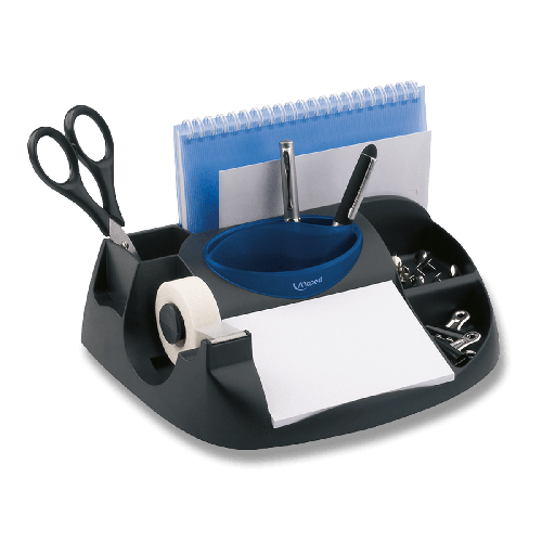 Stolní organizér se zásobníkem na lepicí pásku (19 mm x 33 m), s držákem na dopisy a dalšími přihrádkami na kancelářské potřeby. Dodáváno bez obsahu,Vyrobeno ze 78 % z recyklovaného plastu.