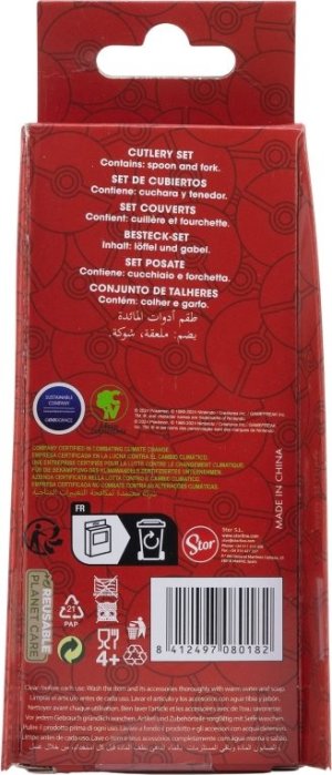sada složená z lžičky a vidličky, díky zaoblenému tvaru se děti mohou naučit používat příbory při jídle zábavným a bezpečným způsobem, díky originálnímu zdobení s motivy nejoblíbenějších postaviček ze světa filmu a televize je budou děti s radostí používat při každém jídle, bez obsahu BPA.