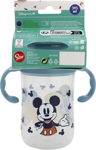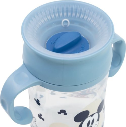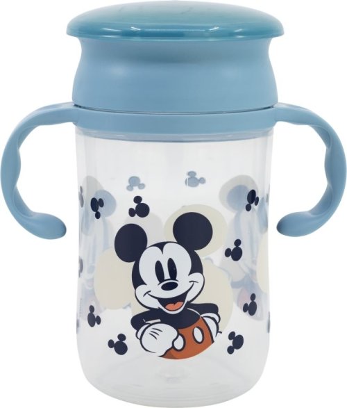 Dětský tréninkový hrnek s víčkem a úchyty s motivem Mickeyho Mouse o objemu 395 ml.