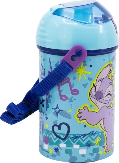 Dětská láhev s popruhem, 450 ml, s motivem Stitche. Praktická plastová láhev s bezpečnostním uzávěrem a popruhy, které obsahují bezpečnostní opatření. Ozdobena postavičkami z nejoblíbenějších filmů a televizních pořadů pro děti.