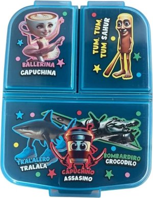 1 velká přihrádka a 2 malé. Odolný materiál. Dekorace na víku. Neobsahuje BPA.