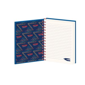 Uvnitř bloku najdete linkované stránky, které jsou ideální pro psaní poznámek, deníkových zápisů nebo úkolů. Na každé stránce je v dolním rohu nenápadný motiv orla z obálky, což podtrhuje celkový design a propojení s tématem Stranger Things. Vnitřní strana přední i zadní desky je dekorována opakujícím se vzorem s logem WSQK 94.5 FM, který působí moderně a elegantně.