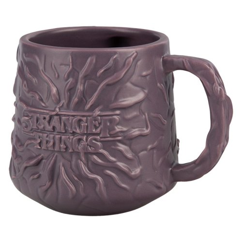 Na přední straně hrnku je vystouplé logo Stranger Things, které je součástí celistvého designu a přidává produktu autenticitu a sběratelskou hodnotu. Tvar hrnku je robustní s mírně rozšířeným tělem a silným uchem, které je rovněž reliéfně tvarované, což zajišťuje pohodlné držení i při horkých nápojích.