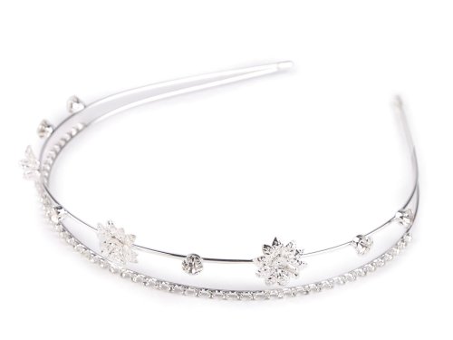 Dvouřadá štrasová čelenka slavnostně dozdobí účes pro jakoukoli příležitost. Vyniká svým rafinovaným designem, který kombinuje jemnost a eleganci. Z kovového drátu je vytvořená konstrukce, na níž jsou pevně připevněná kovová lůžka se skleněnými štrasovými kamínky a květy. Čelenka působí jemným dojmem, díky kamínkům se oslnivě třpytí. Dá se kombinovat s různými druhy účesů, od uvolněných kadeří po elegantní drdoly.