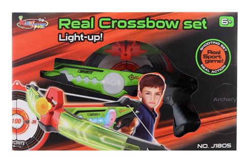 Tento střelecký set obsahuje kuši, terč a pouzdro se 3 náboji s přísavkou. Napájení na 2 AAA baterie, které nejsou součástí balení. Po vložení baterií zbraň svítí a usnadňuje míření. Baleno v krabici. Rozměry balení cca 41x25,5x8 cm. Věk 6+