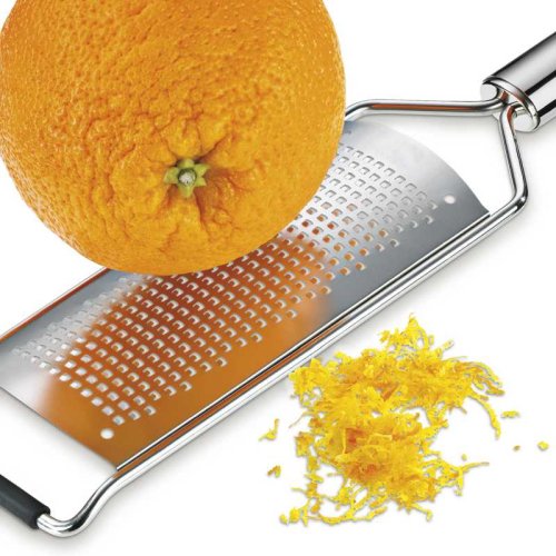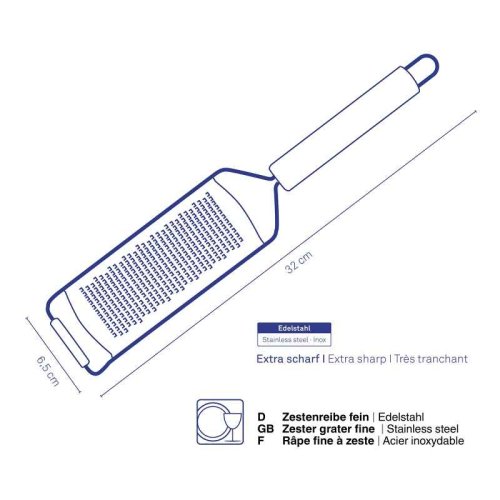 Profesionální struhadlo na kůru citrusových plodů: jemné struhadlo Rondo na strouhání jemných proužků z kůry citronů, limetek nebo pomerančů, tzv. kůry. Kompaktní tvar s konkávním strouhacím povrchem usnadňuje cílené strouhání skořápek. Nerezové struhadlo na kůru s jemným strouhacím povrchem je 6,5 cm široké a 32,5 cm dlouhé. Jemné 2mm, nerez, 32x6,5cm