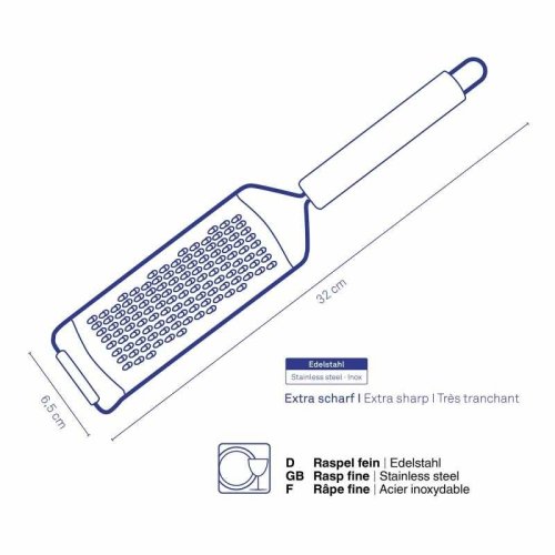 Jemná rašple Rondo z nerezové oceli: tato rašple z řady kuchyňských vychytávek Rondo je vhodná například ke strouhání ovoce (slupky) jako jsou jablka nebo čokoláda a následně ji použít ke zdobení pečiva. Rašple je vyrobena z nerezové oceli, je 6,5 cm široká a 32 cm dlouhá. 3mm, nerezová ocel, 32x6,5cm