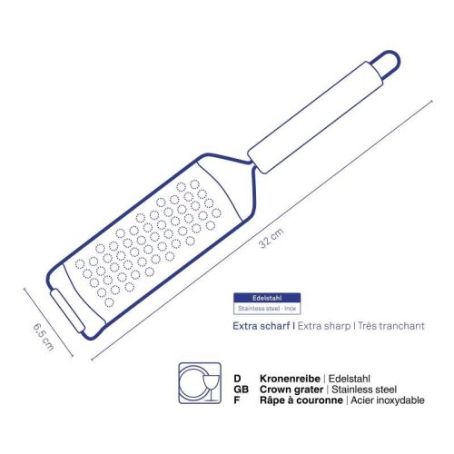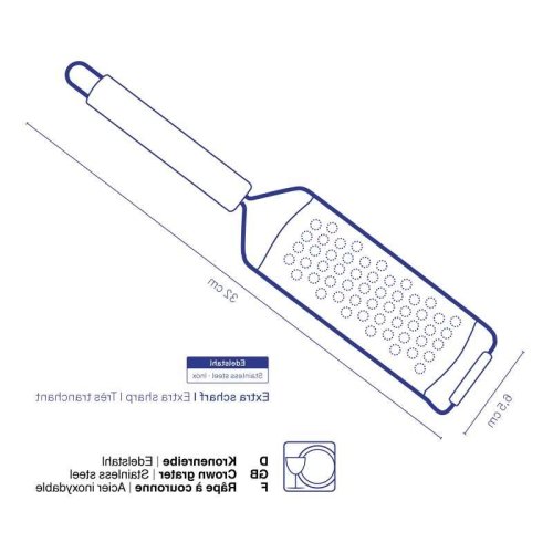 Speciální korunkové struhadlo na strouhání zázvoru, křenu nebo jablek na hrubší kaši. Dá se ale použít i na strouhání čokolády a parmazánu nebo jako struhadlo na citron. Jeho kompaktní tvar s konkávním roštem usnadňuje práci. Korunové struhadlo Rondo je vyrobeno z nerezové oceli o šířce 6,5 cm a délce 32,5 cm. 6mm, nerezová ocel, 32x6,5cm