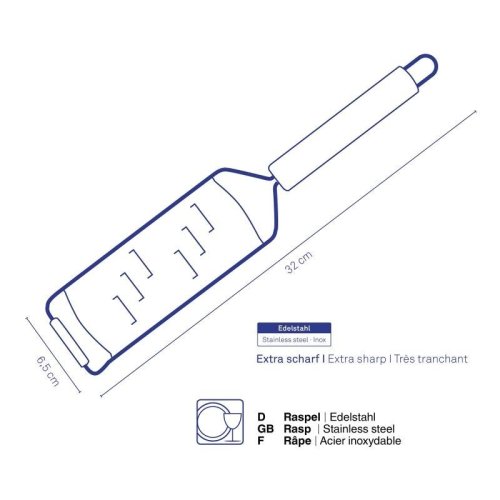 Kráječ na lanýže z nerezové oceli: rašple Rondo je ideální pro strouhání lanýžů, ale je ideální i pro strouhání čokolády. Kompaktní tvar s konkávním povrchem mřížky usnadňuje rašplování. Rašple je vyrobena z nerezové oceli, je 6,5 cm široká a 32 cm dlouhá. 12mm, nerezová ocel, 32x6,5cm